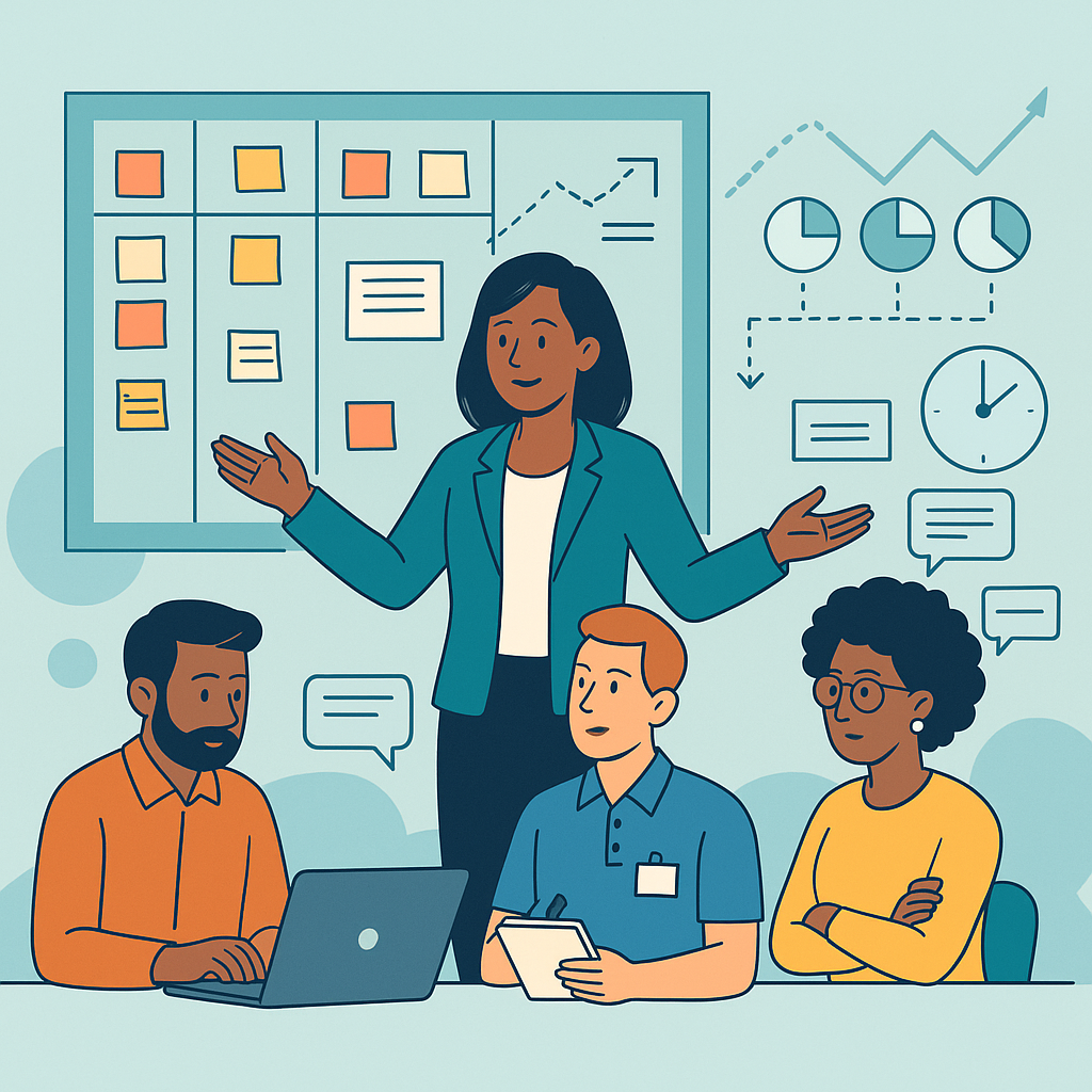 A confident Release Train Engineer leading a collaborative Agile team in front of a Kanban board and data charts.